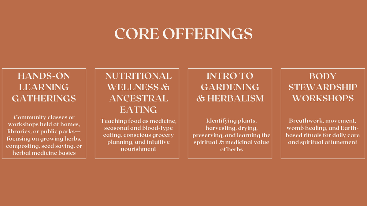 Sacred stewardship is the heart of our environmental and ancestry wellness work. It is where we reconnect with the land our bodies and our responsibility as sacred stewards. Rooted in Afro indigenous practices this program explores holistic living herbal knowledge nutrition seasonal rhythms and land based education to foster wellness from seed to soul.